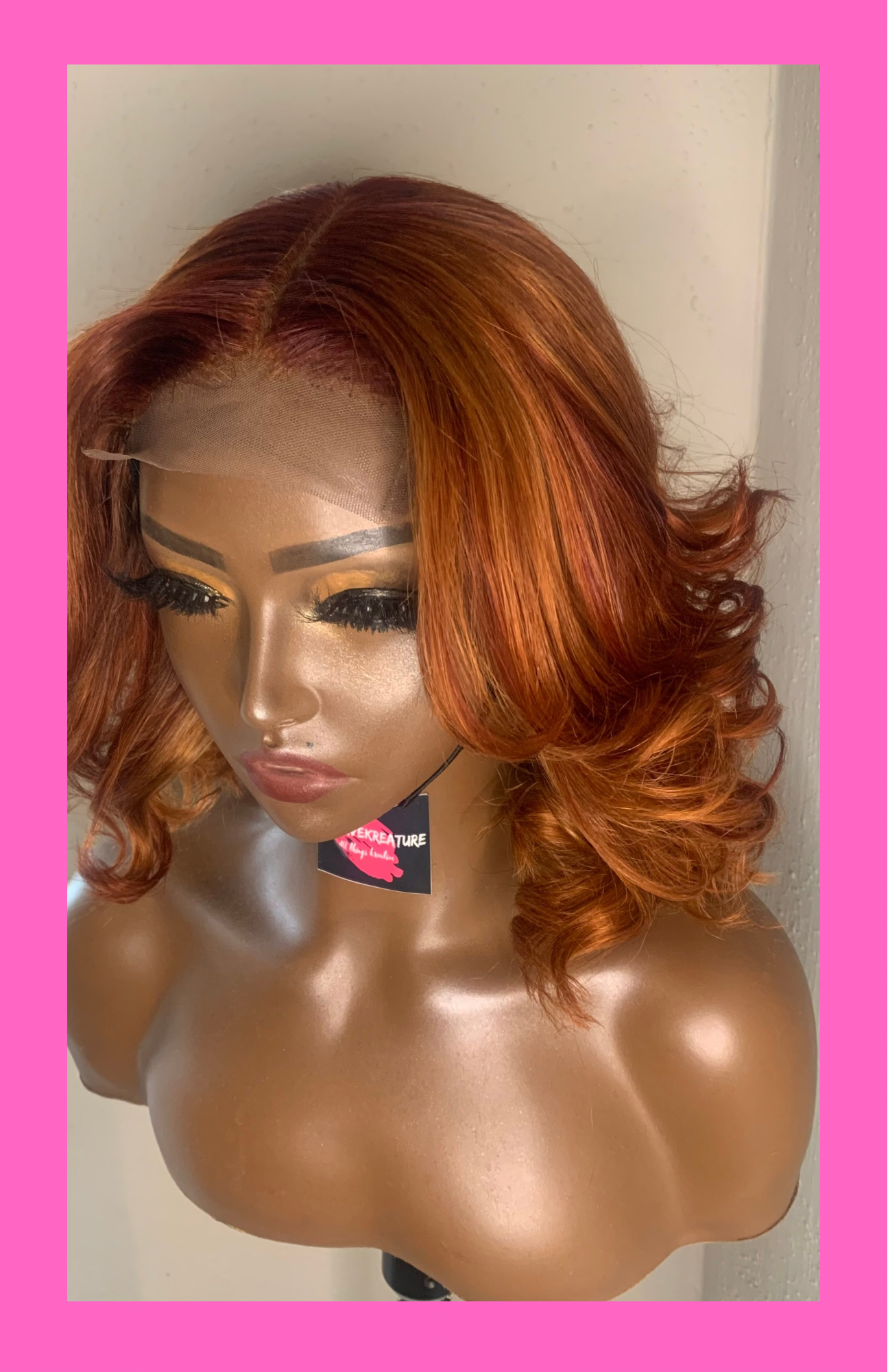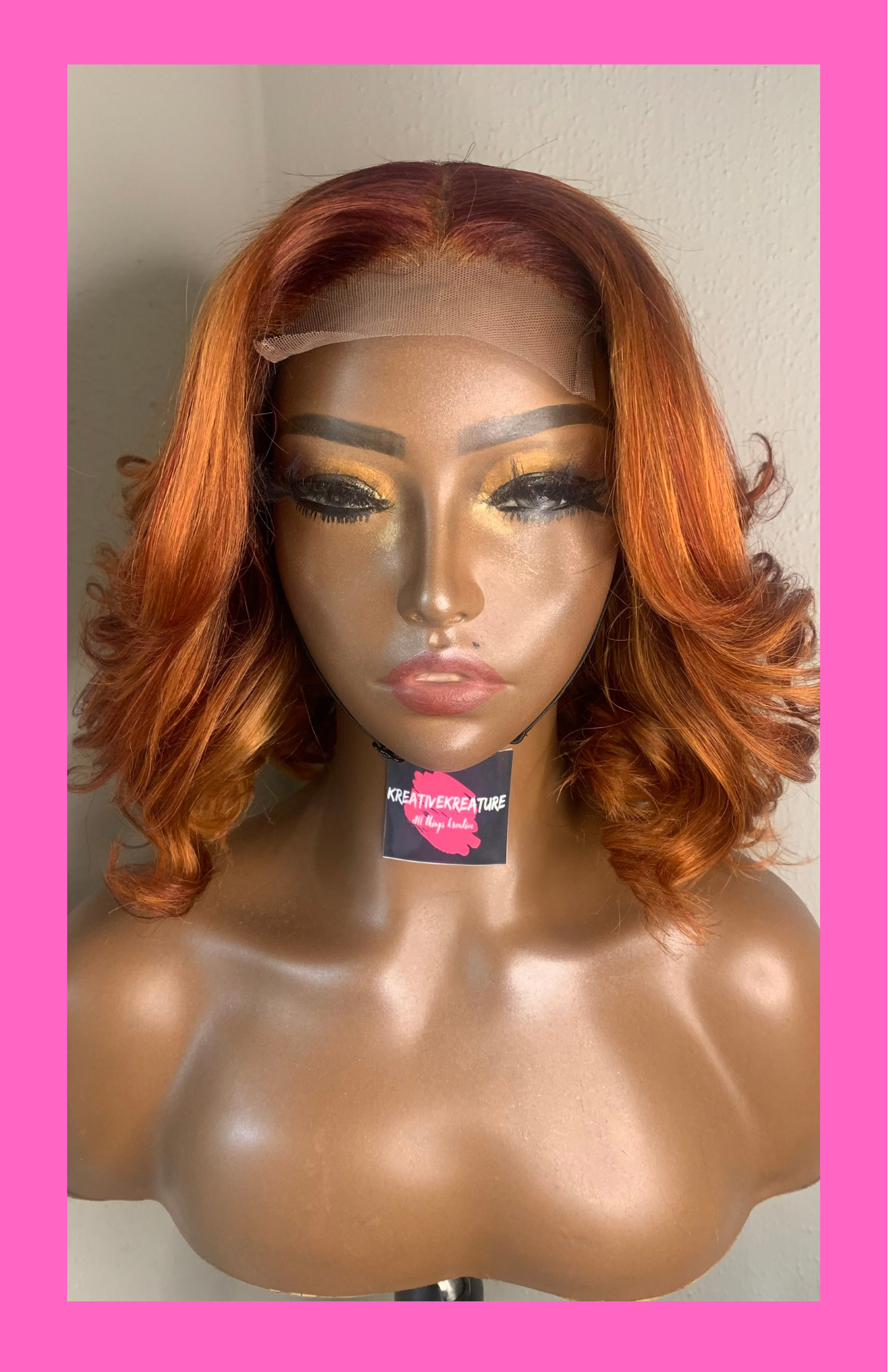 12 inches of ginger with a rich copper red base. Pre-plucked 4x4 lace closure on a stretch dome cap, secured with a comb and adjustable band. Size 23- 23.5 (L) Minimal styling, glueless, ready to wear. Comes curled, can be straightened.