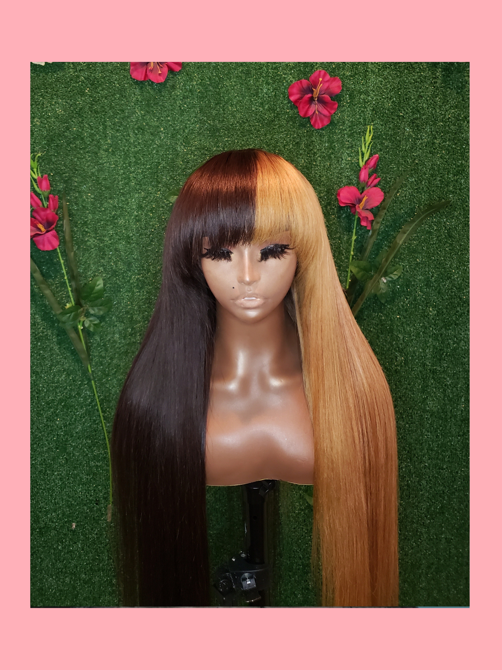 26 inches of honey, chocolate divide, silky straight with a versatile bang, 13x5 lace frontal on a stretch dome cap, secured with a comb and adjustable band. Size 22- 22.5 (A)